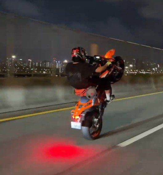 서울 성동경찰서가 검거한 폭주족 일당 중 한 명이 야간에 서울 시내 도로에서 앞바퀴를 들고 주행하는 모습. 성동경찰서 제공 |
