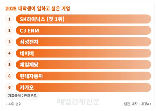 구인·구직 플랫폼 인크루트에 따르면 올해 하반기 공채를 앞두고 ‘2025 대학생이 일하고 싶은 기업’에 관해 조사한 결과 ▲1위 SK하이닉스 ▲2위 CJ ENM ▲3위 삼성전자 ▲4위 네이버 ▲5위 제일제당, ▲6위 현대자동차와 카카오 등이 차지했다.