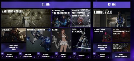 9~11월에도 업데이트 계속... '라운지'와 신규 무기 '검' 그리고 신규 계승자 '해리스' 추가 예고 오는 9월에는 이용자가 보유한 계승자, 스킨, 수집품으로 공간을 꾸밀 수 있는 '라운지' 콘텐츠를 선보일 계획이다. 이용자의 계승자가 '라운지'에서 이용자를 맞이하며 간단한 대화를 건내기도 하고, 게임 플레이를 통해 ‘계승자’, ‘벌거스 피규어’, ‘세트장’을 수집하여 디오라마(실사모형)를 꾸밀 수도 있다.