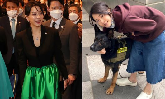 윤석열 전 대통령의 부인 김건희 여사가 2022년 6월29일(현지시각) 스페인 마드리드의 한 호텔에서 열린 스페인 동포 만찬간담회에 참석할 때의 모습.(왼쪽) 2022년 4월 윤 전 대통령이 당선자 신분일 때 김 여사의 모습. 연합뉴스 |