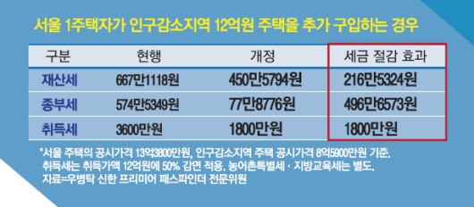 서울에 전용면적 84㎡ 주택 한 채를 보유 중인 A씨가 올 하반기 이후 인구감소지역의 131㎡짜리 고급 아파트(공시가격 8억5000만원·시세 12억원)를 추가로 구입하면 장기보유 세액공제 등 지방 ‘세컨드홈’ 소유에 따른 세제 혜택을 누리게 된다. 지금까지는 추가 구입 시 재산세 667만원과 종합부동산세 574만원 정도를 내야 했다면, 앞으로는 각각 450만원과 77만원 정도만 내면 된다. 700만원 넘는 돈을 절약할 수 있다.