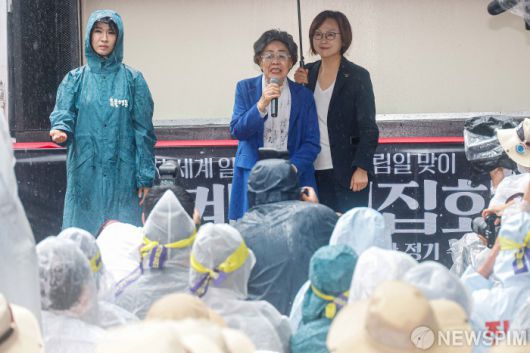 일본군 '위안부' 피해자이자 인권운동가 이용수 할머니(97)는 13일 서울 종로구 옛 일본대사관 앞 평화로에서 열린 제1713차 정기 수요시위 겸 세계연대집회에서 얼굴이 시뻘게질 정도로 간절히 외쳤다. 이날 앞이 뿌옇게 보일 정도로 거센 비가 내렸지만, 경찰 비공식 추산 600여 명의 인원도 우비를 입고 이 자리를 지켰다.