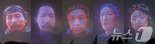 (서울=뉴스1) 안은나 기자 = 광복 80주년을 맞아 14일 오후 서울 여의도 국회 잔디광장에서 열린 국회·국가보훈부·광복회 공동 주최 광복 80년 전야제 ‘대한이 살았다!’에서 독립운동가 드론쇼가 펼쳐지고 있다. 왼쪽부터 홍범도, 김좌진 장군, 안중근 의사, 남자현 열사, 권기옥 선생. 2025.8.14/뉴스1