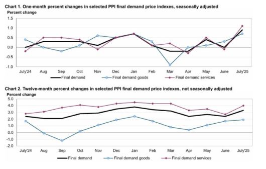 미 노동부 산하 노동통계국(BLS)에 따르면 7월 PPI는 전월 대비 0.9% 상승했다. 다우존스가 집계한 시장 예상치(0.2%)의 4배를 넘는 수치다. 변동성이 큰 식품과 에너지를 제외한 근원 PPI 역시 0.9% 올라, 전망치(0.3%)를 크게 웃돌았다. 식품·에너지·무역서비스를 모두 제외한 지표도 0.6% 상승해 2022년 3월 이후 최대폭을 기록했다.