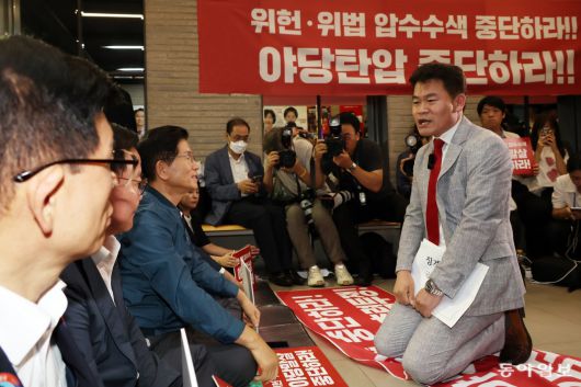 전한길 전 한국사 강사가 14일 오전 서울 여의도 국민의힘 중앙당사에서 열린 중앙윤리위원회 회의에 출석하며 전날 특검의 국민의힘 당사 압수수색을 규탄하며 농성중인 김문수 당대표 후보와 인사 후 발언을 하고 있다. 사진공동취재단/이훈구 기자 ufo@donga.com |