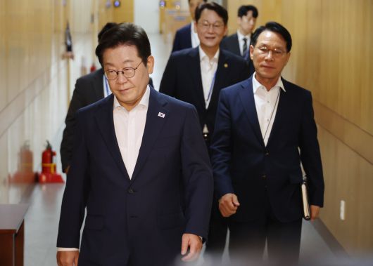 이재명 대통령이 14일 서울 용산 대통령실 청사에서 열린 7차 수석·보좌관 회의에 입장하고 있다./연합뉴스 |