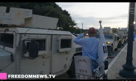 [워싱턴=뉴시스]미국 독립언론인 프리덤뉴스TV는 트럼프 대통령 지시에 따라 워싱턴DC 주방위군의 시내 배치가 시작된 지난 12일(현지 시간) 공개한 영상으로, 워싱턴기념탑 인근에서 군인들을 태운 장갑차가 지나가자 태극기를 지참한 시민이 경례를 하고 있는 모습. (사진=프리덤뉴스TV 영상 캡쳐).2025.08.15. *재판매 및 DB 금지 |