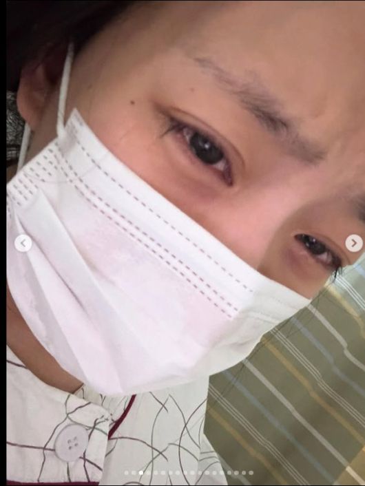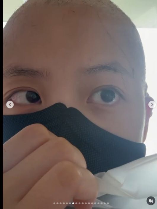 공개된 사진 속 류지원은 병원 환자복을 입고 마스크를 착용한 채 삭발한 모습으로 카메라를 응시하고 있다.