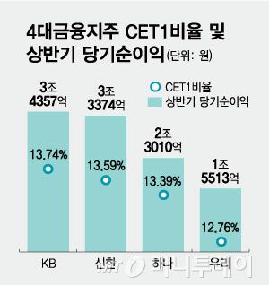 4대금융지주 CET1비율 및 상반기 당기순이익/그래픽=최헌정 |