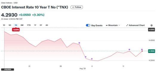 미 국채 10년물 수익률 차트, 자료=야후 파이낸스, 2025.08.15 koinwon@newspim.com |