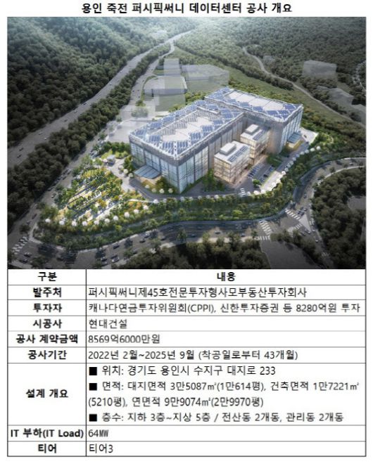 퍼시픽자산운용이 글로벌 연기금인 캐나다연금투자위원회(CPPI), 신한투자증권 등으로부터 8280억원을 투자받아 진행하는 ‘용인 죽전동 퍼시픽써니 방송통신시설 데이터센터’ 개발사업이다.