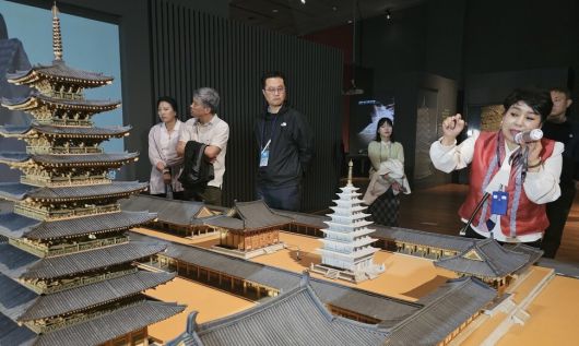 전국 익산시 국립익산박물관 내 미륵사지 전시관에서 문화해설사가 ‘지역사랑 철도여행’ 관광객들을 대상으로 설명하고 있다. 코레일 제공 |