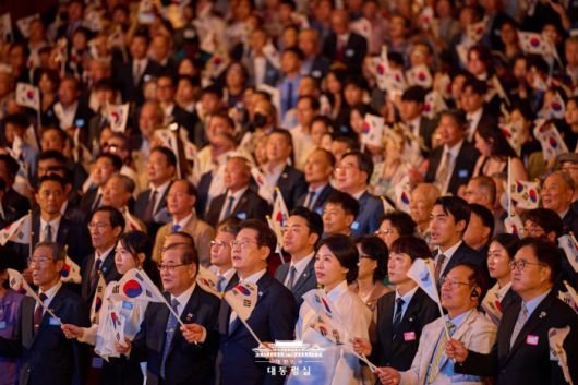 [서울=뉴스핌] 이재명 대통령이 15일 서울 종로구 세종문화회관에서 열린 제80주년 광복절 경축식에서 광복절 노래를 제창하고 있다. [사진=대통령실] 2025.08.15 photo@newspim.com |