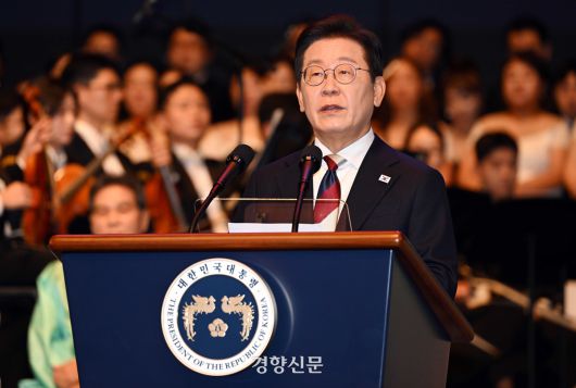 이재명 대통령이 15일 서울 종로구 세종문화회관에서 열린 제80주년 광복절 경축식에서 경축사를 하고 있다. 대통령실사진기자단 |