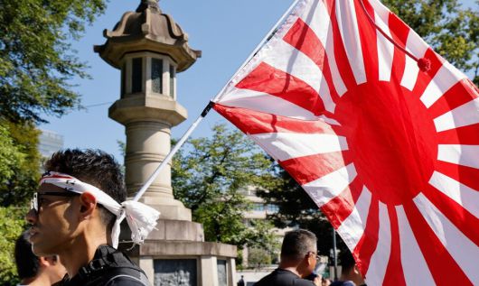 15일 한 일본인이 야스쿠니신사에서 욱일기를 들고 걸어가고 있다. 로이터 연합뉴스 |