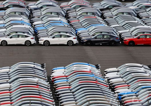 일본 요코하마 산업항의 차량 보관 야적장에 줄지어 주차된 혼다 차량 ⓒ 로이터=뉴스1 |
