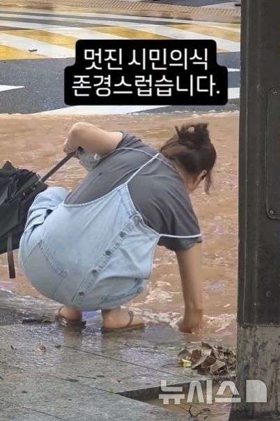 [서울=뉴시스]정풍기 인턴 기자 = 수도권을 덮친 '극한 폭우' 속에서 한 시민이 도로 침수를 막기 위해 맨손으로 오물을 치워 화제다.