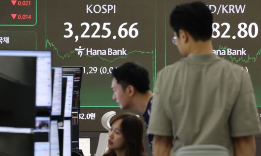 코스피가 1.29p(0.04%) 오른 3225.66에 장을 마감한 14일 서울 중구 하나은행 본점 딜링룸에서 딜러들이 대화하고 있다. 연합뉴스 |
