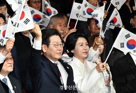 이재명 대통령과 참석자들이 15일 서울 종로구 세종문화회관에서 열린 제80주년 광복절 경축식에서 태극기를 들고 만세삼창을 하고 있다. 대통령실사진기자단 |