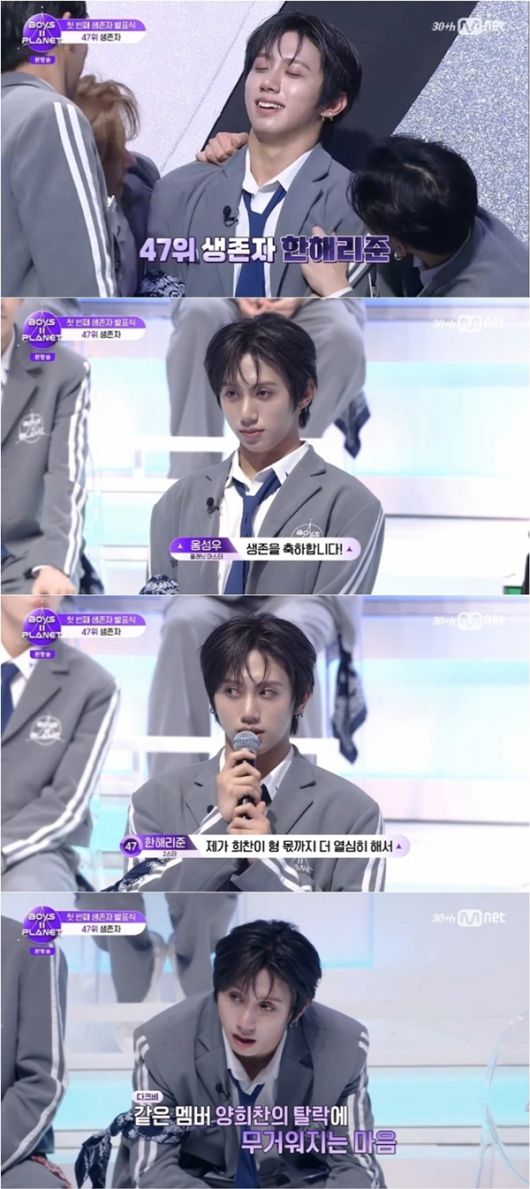 그룹 다크비(DKB)의 멤버 한해리준이 Mnet 글로벌 프로젝트 ‘보이즈 2 플래닛’의 첫 번째 생존자 발표식에서 47위로 생존하며 앞으로의 활약에 기대감을 높였다. / 사진=Mnet ‘보이즈 2 플래닛’ |