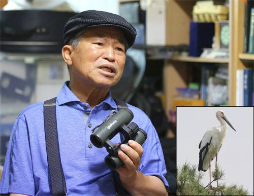 윤무부 경희대 명예교수. 그는 “주변에서 새를 흔히 볼 수 있어 새가 사람을 무서워하지 않으리라고 생각하지만 사실 사람은 큰 천적 중 하나”라며 “새에게 가까이 다가가기보다 거리를 두고 쌍안경으로 바라보는 게 새를 배려하는 방법”이라고 말했다. 작은 사진은 윤무부 교수가 촬영한 천연기념물 제199호 황새. 추석 연휴 동안 아들인 윤종민 씨와 함께 충남 당진에 가서 찍은 것이다. 원대연 기자 yeon72@donga.com / 윤무부 명예교수 제공 |