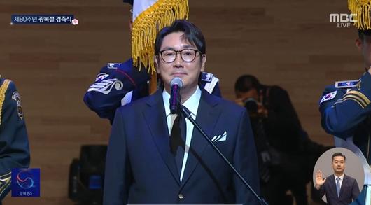 배우 조진웅이 '제80주년 광복절 경축식'에서 대표로 국기에 대한 맹세문을 낭독했다. /유튜브 채널 'MBCNEWS' 영상 캡쳐 |
