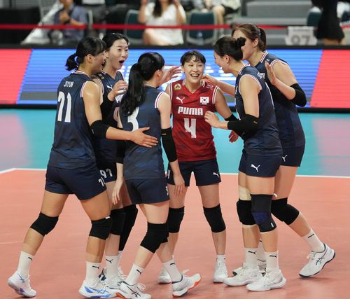 득점 후 기뻐하는 한국 여자배구 대표팀 선수들 |
