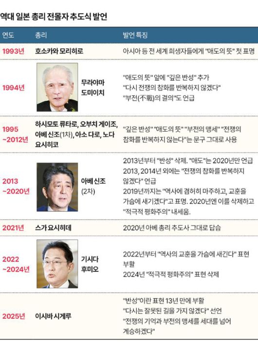 전쟁을 다시는 일으키지 않겠다는 '부전(不戰)의 맹세'라는 표현도 13년 만에 다시 등장했다. 이 표현은 아베 전 총리가 재집권하면서 "전쟁의 참화를 반복하지 않겠다"는 표현으로 순화됐다. 그러나 이시바 총리는 원래 표현을 다시 사용해 '전쟁하지 않겠다'는 의지를 강조한 것이다.
