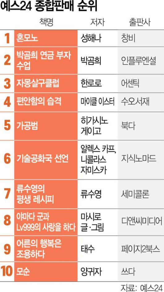 성해나의 ‘혼모노’가 예스24 8월 둘째 주 종합판매 1위에 올랐다. 구독자 85만 명에 달하는 인기 금융 유튜버 박곰희의 재테크 서적 ‘박곰희 연금 부자 수업’이 2위, 싱어송라이터 한로로의 미니 앨범과 연계된 동명 소설 ‘자몽살구클럽’이 3위를 기록했다. 영화평론가 이동진이 추천한 ‘편안함의 습격’은 4위, 일본의 ‘미스테리 거장’ 히가시노 게이고의 신작 ‘가공범’은 5위였다.