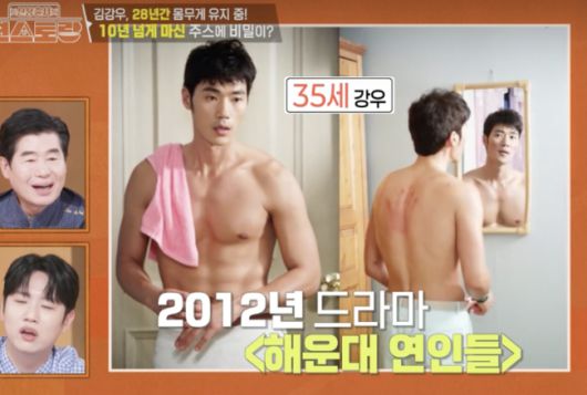 이날 47세 답지 않은 동안 비주얼의 김강우에게 평소 관리를 어떻게 하는지 물었다.김강우는 “어느 인터뷰에서 고등학생때 몸무게 동일하다고 말해 고3때 몸무게”라며, 28년간 74~76kg 유지 중이라 했다. 실제 한결같은 근육남 몸매도 공개됐다. 이어 몸무게를 검증했고, 실제 75.6kg가 나왔다. 평소에도 매일 무지개 색깔 양말로 인증한다는 것.