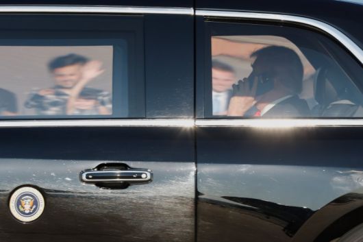 도널드 트럼프 미국 대통령이 블라디미르 푸틴 러시아 대통령과 정상회담이 예정된 알래스카로 가기 위해 15일(현지시간) 메릴랜드주 앤드루스 합동기지로 이동하는 차 안에서 휴대폰으로 통화하고 있다. AP 뉴시스 |