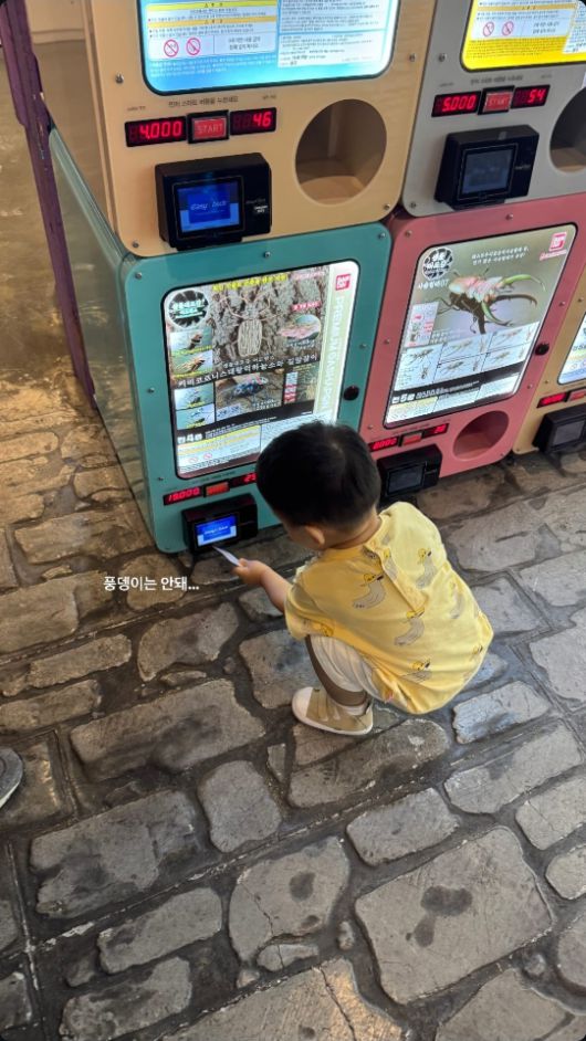 손연재는 15일 인스타그램에 “풍뎅이는 안돼…”라는 글과 함께 한 장의 사진을 공개했다. 사진 속 준연군은 노란 오리 무늬 티셔츠를 입고 곤충 자판기 앞에 앉아 결제 시도를 하는 듯한 모습. 자판기에는 4,000원이 표시돼 웃음을 자아냈다.