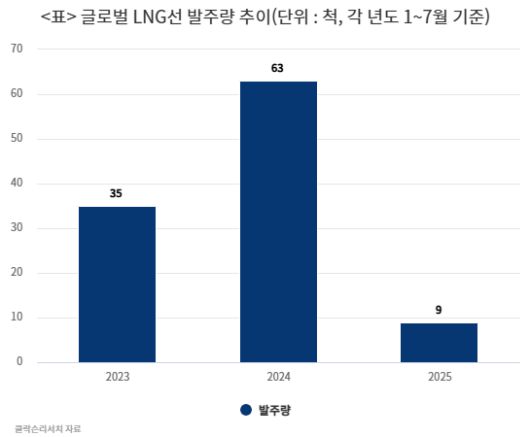 16일 영국 조선해운시황 분석기관 클락슨리서치에 따르면 올해 1~7월 글로벌 LNG선 발주량은 9척(78만8267CGT)에 그쳤다. 전년 동기(63척, 593만2093CGT) 대비 척수 기준 7분의 1에 불과하다. 2023년 1~7월(35척, 304만8296CGT)과 비교했을 때도 26척 줄었다.