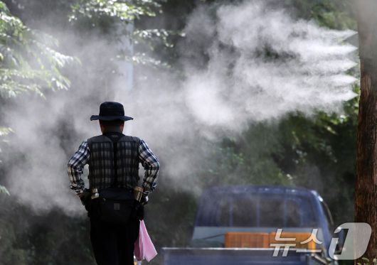삼복더위를 지나 다시 폭염이 찾아온 15일 대구 남구 고산골 등산로에 쿨링포그가 가동돼 무더위에 지친 시민들의 더위를 식혀주고 있다. 2025.8.15/뉴스1 ⓒ News1 공정식 기자 |