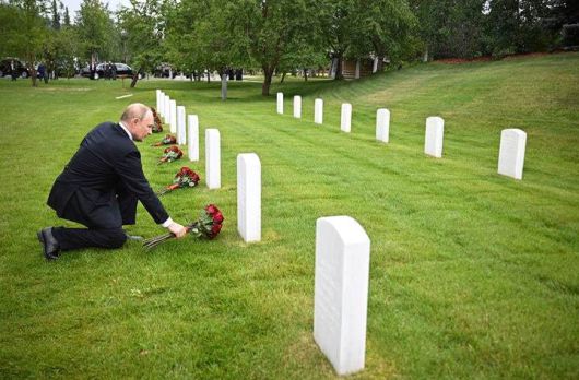 15일(현지 시간) CNN 등에 따르면 푸틴 대통령은 이날 알래스카 최대 도시인 앵커리지 북부 엘먼도프-리처드슨 합동기지에서 3시간여 동안 회담 및 공동 기자회견을 진행한 뒤 곧바로 인근에 위치한 추모 묘지로 향했다. 크렘린궁은 “(해당 묘지는) 제2차 세계대전 당시 미국에서 소련으로 군수 물자를 수송하다 사망한 소련군 조종사 및 장병들을 기리는 장소”라고 설명했다. 푸틴 대통령은 묘비 앞에 한쪽 무릎을 꿇은 채 장미꽃을 다발째 놓고 십자 성호를 그었다.