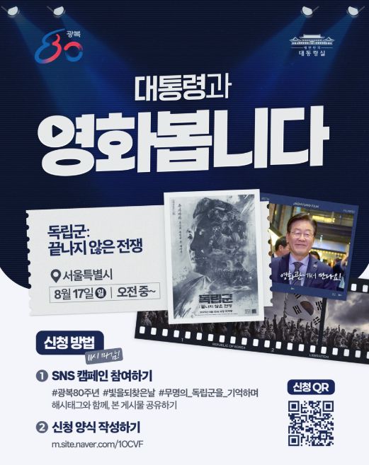 이재명 대통령이 광복 80주년을 맞아 국민과 함께 영화를 관람하는 행사를 갖는다.