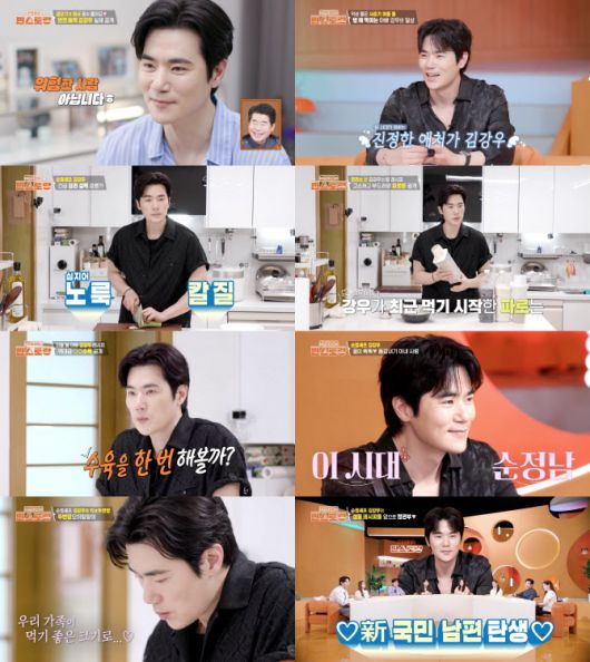 김강우는 매일 아침 직접 만든다는 ‘10년 삭제 주스’ 레시피를 공개해 시선을 모았다. 10년간 하루도 빠짐없이 아내를 위해 이 주스를 준비했다는 사실에 스튜디오가 술렁였다. 결혼하고 자녀를 얻게 된 후 담배를 끊고 술도 줄였으며, “아내에게 밥 차려 달라는 말은 절대 하지 않는다”는 발언은 그의 가족 중심적인 가치관을 드러냈다. 또한 방학 때에는 4~5끼를 먹는 두 아들을 위해 손수 요리를 하고, 집안일을 운동 삼아 돕는 일상까지 공개해 ‘순정 셰프’라는 별명을 얻었다.
