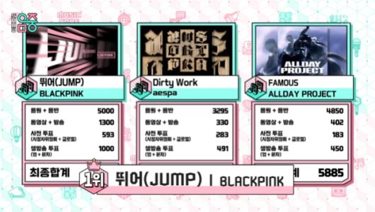 16일 방송된 MBC '쇼! 음악중심'에서는 블랙핑크 '뛰어(JUMP)'가 8월 셋째주 1위를 차지했다.