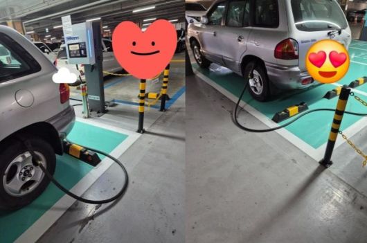 해당 차량은 전기차가 아님에도 불구하고 전기차 주차 구역 한 자리를 차지하고 있었다. 차주는 충전선을 뽑아 바퀴 위에 올려놓은 채 자리를 비운 상태였다.