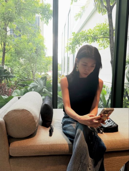 공개된 사진 속 하지원은 블랙 민소매 톱에 청바지를 매치해 세련된 스타일을 완성했다.