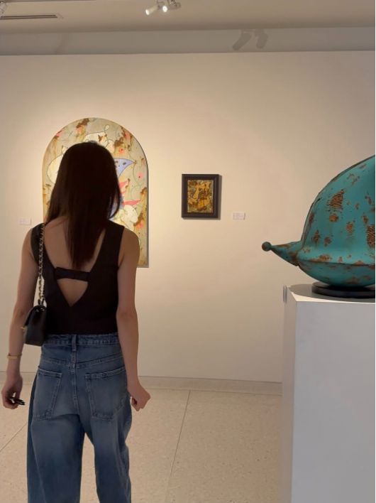 특히 테이블 유리에 비친 실루엣까지 더해져 우아한 매력을 배가시켰다. 또 다른 컷에서는 전시장을 찾아 예술 작품을 감상하며 여유로운 시간을 보내는 모습이 담겼다.