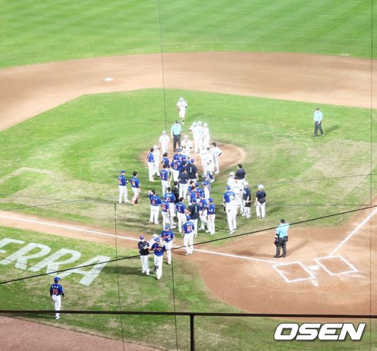 다행히 신민혁이 곧장 사과를 했고, 양 팀 선수들도 충돌 없이 벤치 클리어링 상황을 정리했다. /waw@osen.co.kr
