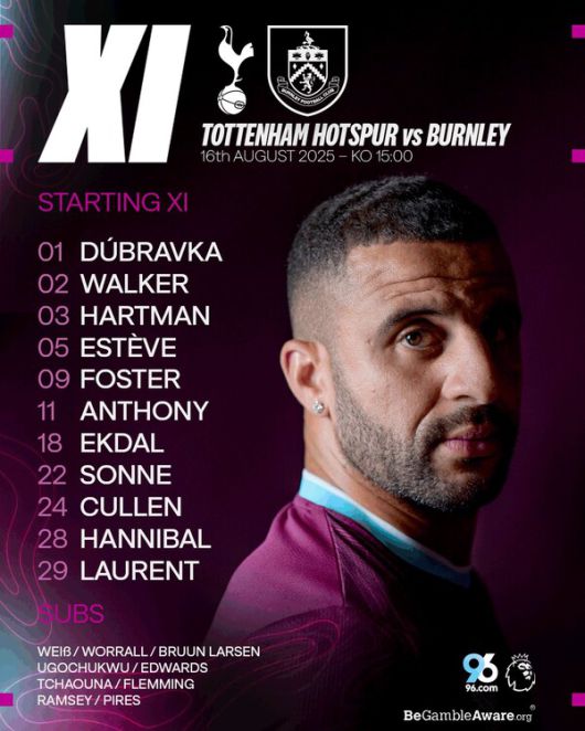 승격팀 번리는 5-4-1 전형으로 맞수를 뒀다. 마르틴 두브라브카가 골문을 지켰고, 크빌린치 하르트만, 막심 에스티브, 얄마르 에크달, 카일 워커, 올리버 손느가 백5를 구축했다. 2선 측면에는 제이든 앤서니와 한니발 메브리가, 중앙에는 조쉬 컬렌과 조쉬 로랑이 섰다. 최전방 공격수는 라일 포스터.