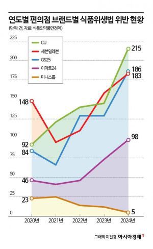 17일 식품의약품안전처가 국회 보건복지위원회 소속 김미애 국민의힘 의원실에 제출한 '최근 5년간 편의점 브랜드별 식품위생법 위반 현황' 자료에 따르면 주요 편의점 업체들의 식품위생법 위반 건수는 매년 증가하고 있는 것으로 나타났다.