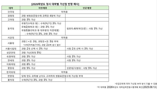 21일부터 2026학년도 대학수학능력시험 원서 접수가 시작된다. 원서 접수 시 수험생들이 신중히 고민해야 할 것은 국어·수학·탐구영역 과목 선택이다. 접수 기간 후에는 선택과목 변경이 불가능해서다. 최근 많은 대학이 자연계열 선택과목 지정을 완화하는 흐름을 보이고 있지만, 수학 미적분·기하나 과학탐구 응시자에 가산점을 부여하는 경우도 있어 최종 과목 선택 전 희망 대학의 선발방식을 확인하는 것이 중요하다. 진학사 입시전략연구소는 “대학별 수시 수능최저 반영 과목, 정시 필수 응시과목 및 가산점 등을 확인해야 한다”고 조언했다. 17일 진학사 입시전략연구소가 대학별 선택과목 지정과 가산점 등을 정리했다.