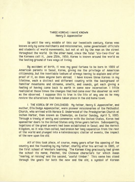 도지 아펜젤러의 회고 글은 1951년 10월 부산에서 작성됐다. 6·25전쟁 당시 기독교세계봉사회의 한국 책임자로서 구호 활동에 나섰던 그는 ‘내 어린 시절의 한국’, ‘일본의 한국’, ‘해방된 한국’으로 나눠 그가 겪은 한국을 기록했다.