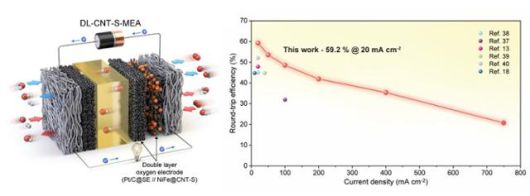 박 교수팀은 귀금속 대신 산소전극을 두 개의 층(더블 레이어)으로 설계해 이 같은 문제를 개선했다. 안쪽은 연료전지 작동 시 성능을 높이는 촉매층으로, 나노촉매와 이오노머(고분자 사슬에 이온기를 포함하는 특수한 종류의 고분자)를 혼합했다. 바깥쪽은 수전해 작동 시 전기 흐름을 원활히 하는 탄소나노튜브 구조로 만들었다.