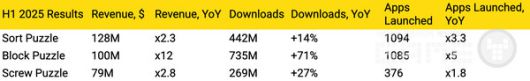 만약 당신이 보고서를 열자마자 이 섹션으로 바로 스크롤했다면, 우리는 충분히 이해한다. 나사, 퍼즐, 블록은 요즘 업계에서 가장 많이 사용되는 단어들 중 일부이며, 그것은 놀라운 일이 아니다. H1 2025의 연간 수치들을 살펴보자. 블록 퍼즐은 수익이 12배 증가했고, 나사 퍼즐은 2.8배, 정렬 퍼즐은 2.2배 증가했다.