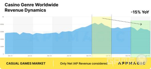 슬롯은 16억 달러 수익으로 전년 대비 7% 감소했고, 2억 4500만 다운로드로 8% 감소했다. 대표작으로는 라이트닝 링크 카지노 슬롯, 잭팟 파티 - 카지노 슬롯, 더블다운 카지노 베가스 슬롯이 있다. 캐주얼 카지노는 12억 달러 수익으로 32% 감소했고, 7800만 다운로드로 12% 감소했다. 대표작으로는 모노폴리 고, 코인 마스터, 다이스 드림즈가 있다. 카지노 카드 게임은 4억 5500만 달러 수익으로 6% 증가했고, 2억 2900만 다운로드로 8% 증가했다. 대표작으로는 더블유에스오피 포커: 텍사스 홀덤 게임, 제이제이 도우디주-환러 치파이 휴시엔 허지, 지잉가 포커- 텍사스 홀덤 게임이 있다.