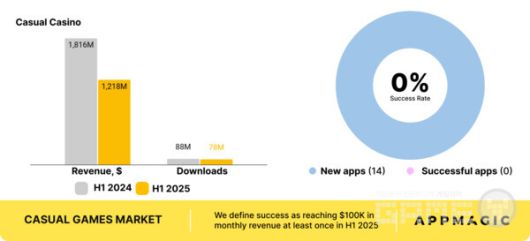 캐주얼 카지노에게 2025년 전반기는 새로운 정상을 향한 전환을 의미했다. 이 장르는 33% 연간 수익 감소를 보며 12억 달러로 떨어졌다.